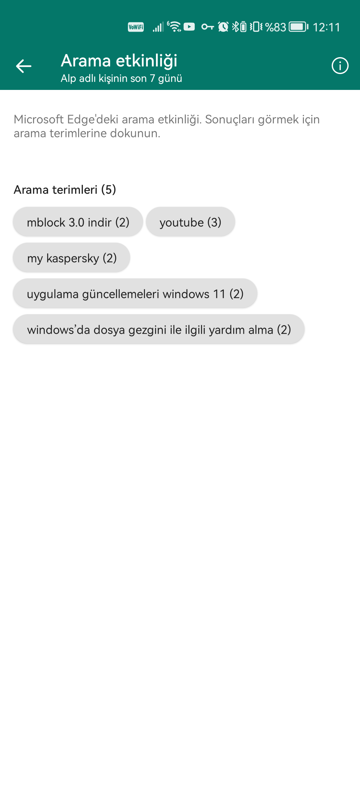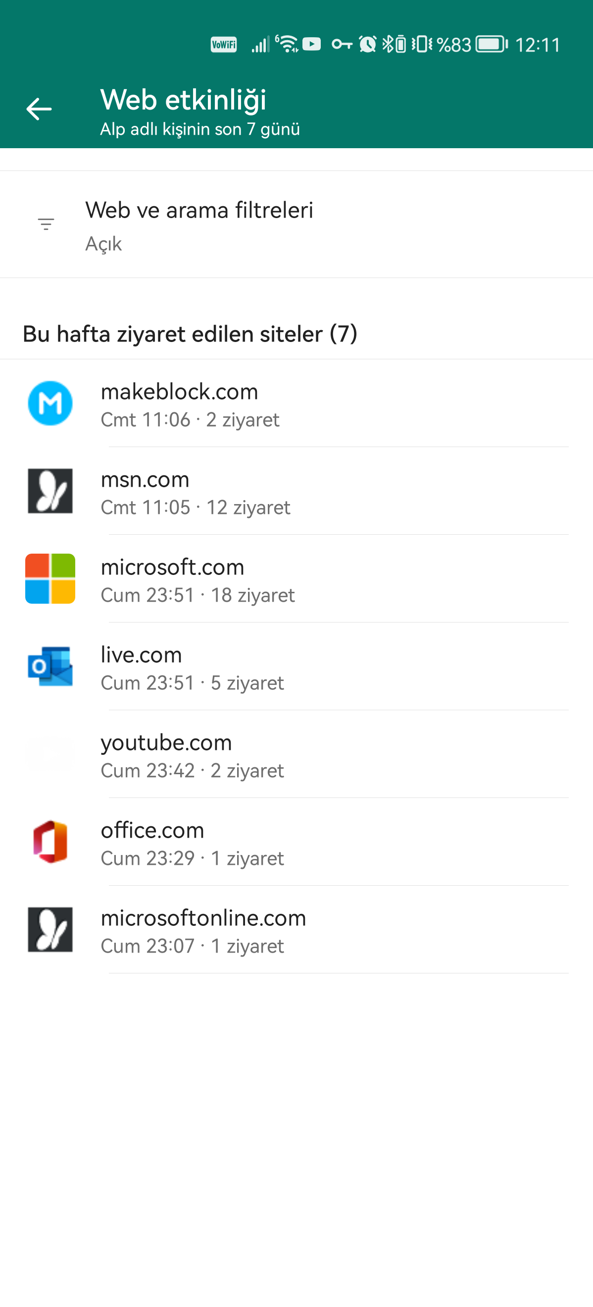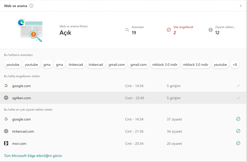 Gördüğünüz gibi günlük bilgisayar kulanımı, uygulama bazında süreler ayrıntılı bir şekilde görülebiliyor, yüklü uygulamalara tek tek erişim süresi atayabiliyorsunuz, tek bir oyunda veya uygulamada saatler harcamasına engel olarak, vaktini dengeli kullanmasına yardımcı olabilirsiniz aynı şekilde web de yapılan aramalar, erişmek istediği web siteleri detaylı bir şekilde raporlanıyor.